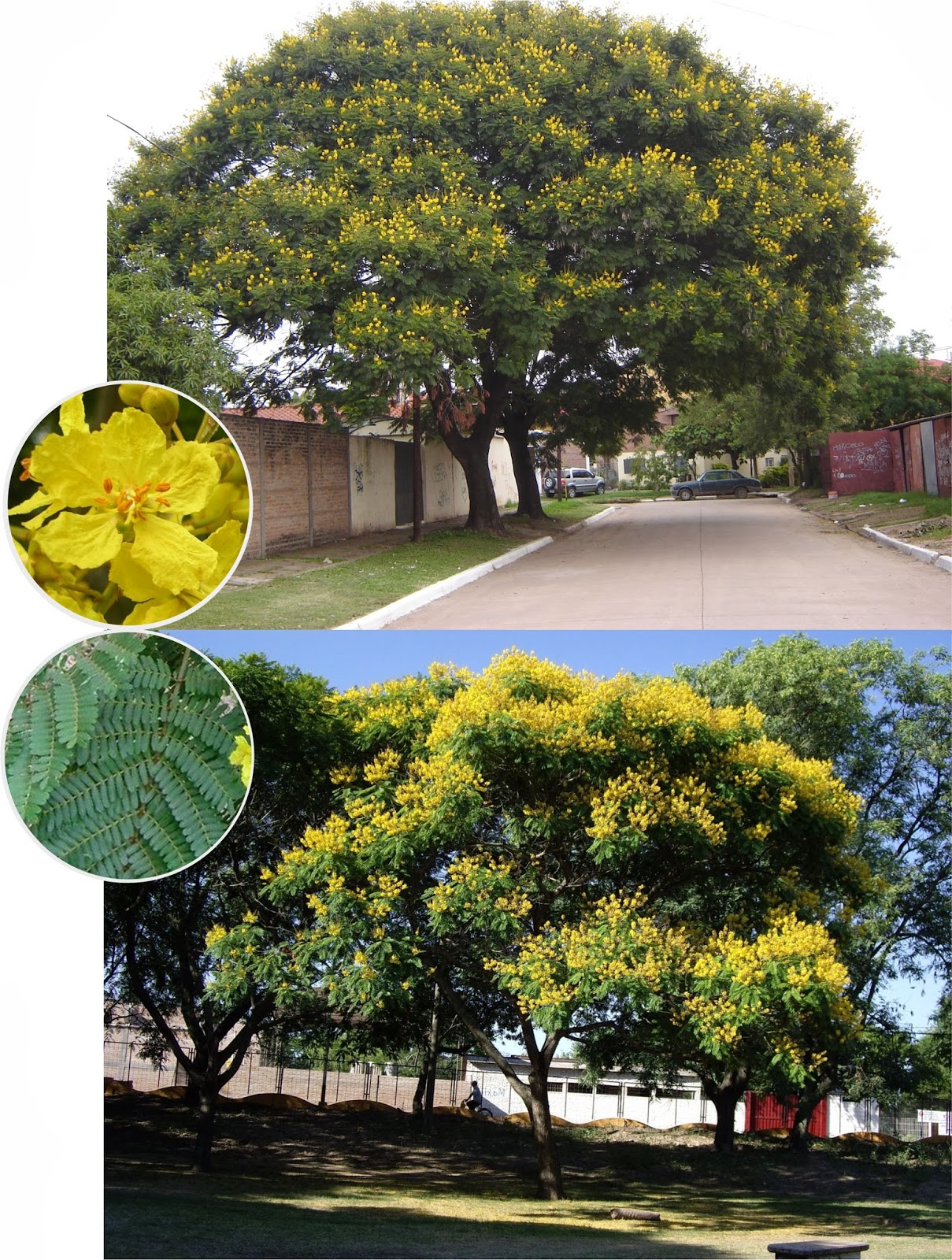 "Yvyra pytâ, es el nombre guarani del árbol llamado Palo Brasil. Según dicen, los holandeses fueron los primeros en explotar las costas del Este brasileño, y ellos consignaban en sus mapas el nombre de Brasil a ésas tierras, por la madera, roja como brasas, del Yvyrapytâ. Sus barcos regresaban cargados de rollos de ése árbol y la referencia a la madera dio nombre al lugar de su origen. Realmente es asombrosa la altura y corpulencia que adquieren en las selvas. También, como ciudadanos, los encontramos por todas las plazas, parques, calles y patios. La robusta estampa de su tallo, grueso y rugoso, ornamenta con elegancia la ciudad. Brinda la sombra de sus frondas y la belleza de sus flores. Los vemos crecer por doquier. La madera es pesada y dura, apreciada para hacer marcos, vigas y diversas obras. Pero, atención, si usted pide en un aserradero ésta preciosa madera, le venderán una parecida, no tan colorada, que se llama Caña Fístula.
